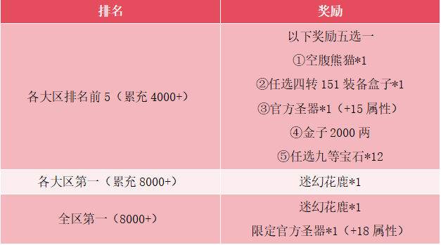 2.活动期间,将统计所有区服的充值玩家,其中各区充值第一(且满足累充8000+)的玩家额外赠送迷幻花鹿*1;所有区服中充值第一的玩家(且满足累充8000+)额外赠送迷幻花鹿*1和限定官方圣器*1(+18属性)。