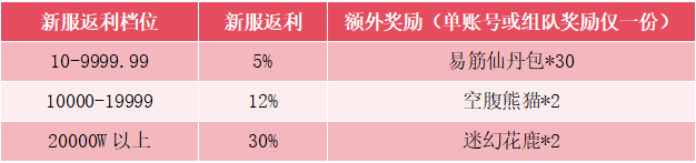 4.返利金子及额外奖励将根据单账号(或组队)总充值金额进行发放,奖励仅有一份,组队参与请确认好如何发放到账号,发放后将不再更换;