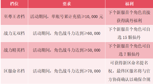 2.仙丹福利将发放至玩家在下个新服创建的第一个角色,且该新服账号的实名认证信息必须与本区参与活动的榜单账号完全一致,福利一经发放,不可转移、不可交易。