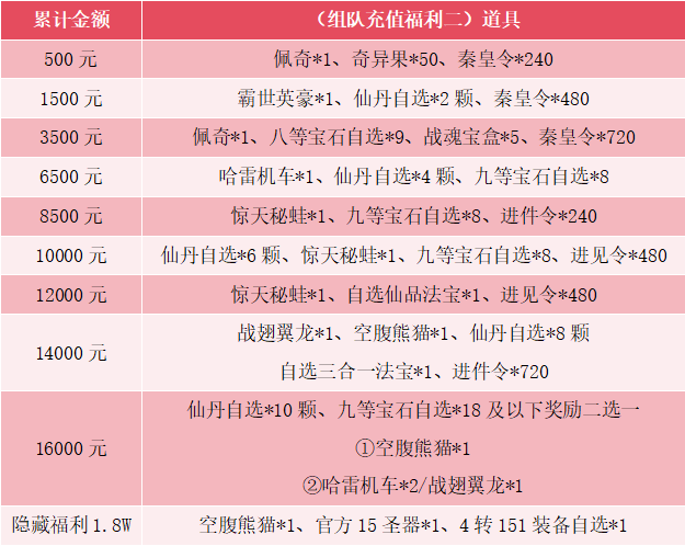 8.“组队二”活动奖励均为不绑定道具,可自由交易,充值18000元将解锁隐藏福利,隐藏福利为列表展示奖励,无其他额外奖励。