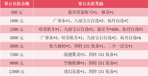 1.此活动为期间累计充值活动不限充值类型,发放道具为不绑定道具,联系客服发放;