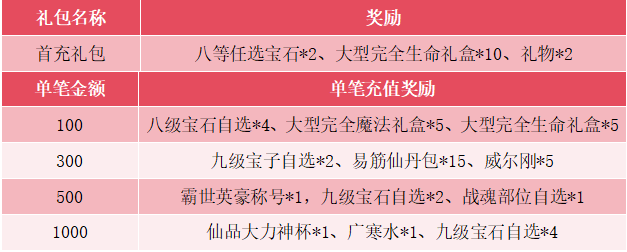 2.单笔充值对应金额(不限充值方式),即可领取对应金额奖励,充值后联系客服发放奖励,发放成功后请在充值账号角色游戏内“虚宝提取员”领取。(例如,单笔500将不能领取单笔100和300的奖励)。