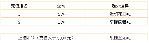 【活动详情】:活动期间累计充值大于3000元即可上榜,根据排名可以额外活动顶级奖励。