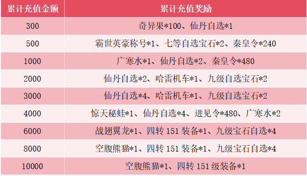 【活动规则】:活动期间内,单账号充值达到累计对应金额即可领取对应奖励(充值不限制充值类型),发放道具均为不绑定道具。充值后请联系客服灵官核实后发放奖励,充值到达额度上限后将会重新计算充值。